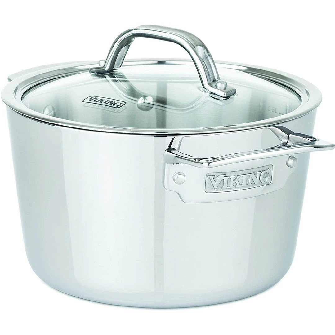 The Viking contemporary 3-ply stainless steel 3.4-Quart soup pot with vented glass lid combines a modern, Windsor pan-inspired design with the exceptional performance of 3-ply stainless steel cookware. The convenient size does double duty as a small Dutch oven, soup pot, or saucepan. The conical sides are angled out to provide more surface area for evaporation, while the walls retain more heat resulting in faster cooking times. The vented glass lid allows you to monitor the cooking progress of your meal while reducing the chance of boilovers. Additional features include a unique sealed rim that completely encapsulates the aluminum layer inside the stainless steel. internal volume markings in both us and metric units make measuring liquids directly into the pan quick and easy. The Viking contemporary cookware combines a layer of aluminum alloy sandwiched between heavy-gauge stainless steel. The aluminum core provides exceptional heat transfer throughout the cookware transferring heat evenly across the bottom and sides of the pan for rim-to-rim cooking. The exterior layer is magnetic stainless steel making it incredibly durable and safe for all cooktops, including induction. The interior cooking layer is 18/8 non-reactive stainless steel that is easy to clean and prevents the transfer of metallic flavor when cooking acidic foods like tomato sauce. The Viking signature stay-cool handle is ergonomically designed for a secure grip, comfort, balance, and control while remaining cool to the touch thanks to the built-in heat break in the long handles. Oven, broiler, and grill safe up to 600 DegreeF/315 DegreeC (oven safe up to 450 DegreeF/232 DegreeC with glass lid), dishwasher safe and features a manufacturer’s limited lifetime warranty. From stovetop cooking to oven finishing this cookware is designed to help you deliver professional results in your own home.