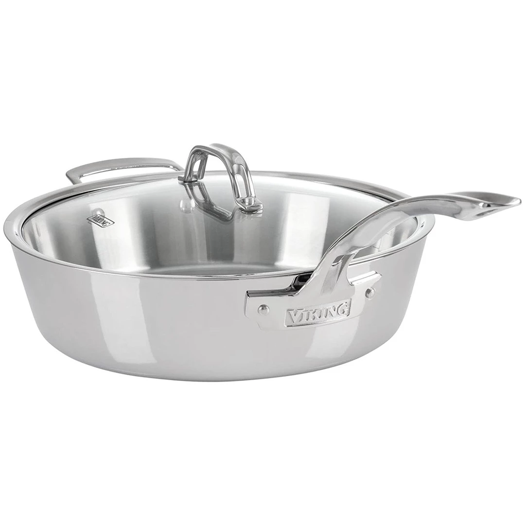 The Viking Contemporary 3-Ply Stainless Steel 4.8 Quart Sauté Pan with Lid combines a modern, Windsor pan inspired design with the exceptional performance of 3-Ply stainless steel cookware. The conical sides are angled out to provide more surface area for evaporation, while the walls retain more heat resulting in faster cooking times. The vented glass lid allows you to monitor the cooking progress of your meal while reducing the chance of boil-overs. Additional features include a unique sealed rim that completely encapsulates the aluminum layer inside the stainless steel. Internal volume markings in both US and metric units make measuring easy. All Viking Contemporary cookware combines a layer of aluminum sandwiched between heavy-gauge stainless steel. The aluminum core provides exceptional heat transfer throughout the cookware, while the magnetic stainless steel exterior makes it incredibly durable and safe for all cooktops, including induction. The Viking signature stay-cool handle is ergonomically designed for a secure grip, comfort and balance, while remaining cool to the touch. Oven, broiler and grill safe up to 600°F/315°C (oven safe up to 450°F/232°C with glass lid), dishwasher safe and features a manufacturer’s limited lifetime warranty. Viking, designed to delivery Professional Performance for Your Home.