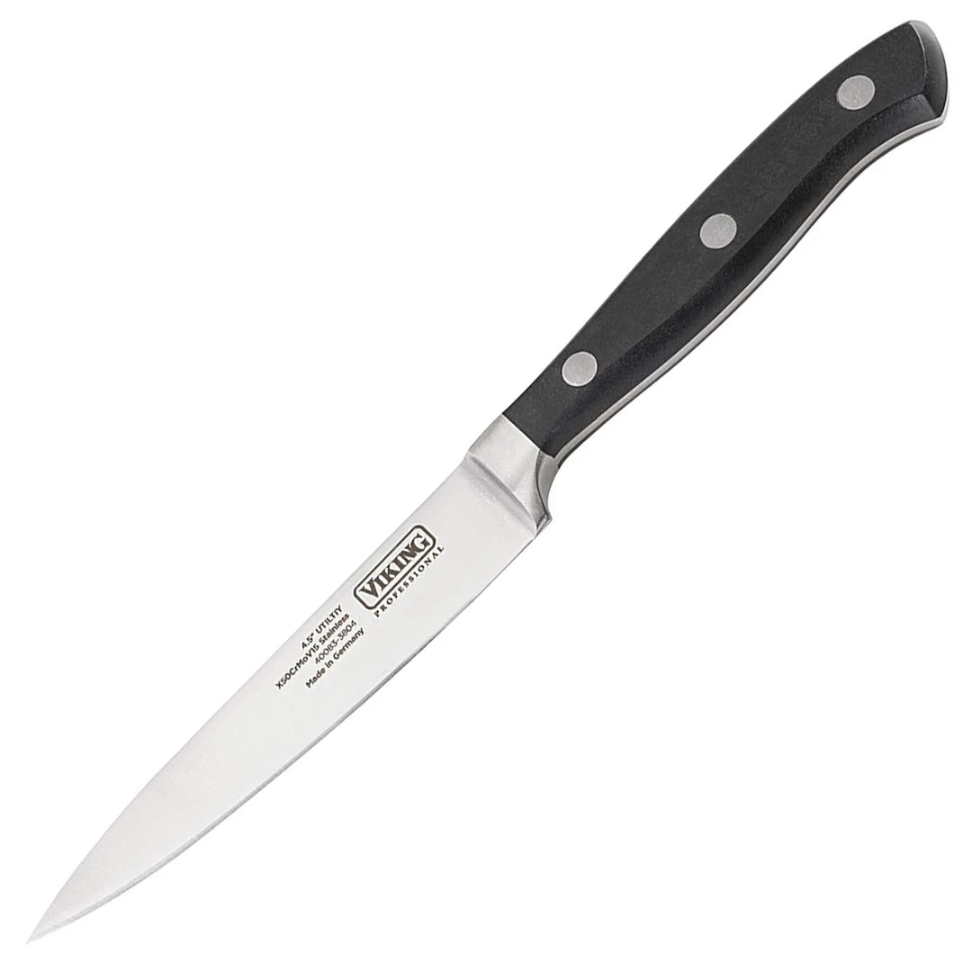 Designed in Germany, Viking Culinary Professional Utility Knife delivers uncompromising performance due to the exceptional balance between the blade and handle. This fully forged knife is constructed with an integrated tang and riveted POM handle. Forged from high-alloy steel to ensure sharpness, deliver edge retention and resist corrosion, Viking Professional Cutlery features durable German stainless steel with a Rockwell hardness rating of 55-56. Designed for both home and professional use, this knife was created with the demands of a professional chef in mind. The ergonomically designed handle was developed with a focus on comfort and ease of use featuring exceptional balance so that they are as ergonomic as possible. With little to no weight on the upward lift, Viking Culinary Professional Cutlery is designed to be an extension of the hand and eliminate fatigue. The blades feature a 15-degree cutting edge that is heat hardened under inert gas to ensure strength and long life. The combination of the cutting edge angle and the Rockwell hardness of the steel create the perfect balance between edge retention and the ability to sharpen the blade. Viking Culinary Professional Cutlery is completely hygienic with no gaps between the blade and handle. The bolster and integrated tang deliver stability and balance while protecting the users hand from the blade. The Viking Culinary Professional Cutlery line is backed by a lifetime warranty. Viking products began with a passion for cooking. Viking Culinary offers a full assortment of culinary products that deliver on the Viking promise of Professional Performance for Your Home. You Know our Kitchens; Now Discover our Cookware.