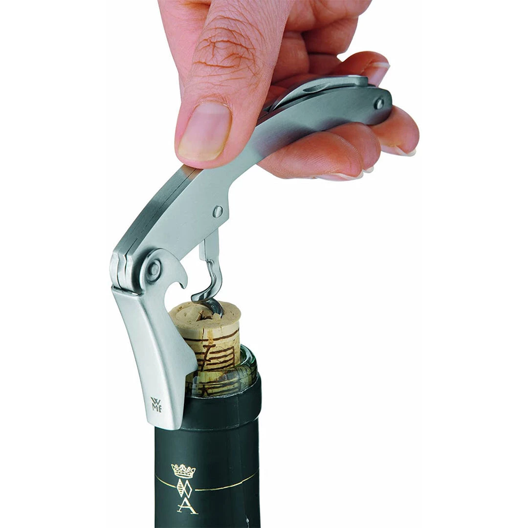This WMF Clever and More Corkscrew, in the popular waiters’ style, features high-quality stainless steel construction and a classic design. On one side a little knife pulls out for foil cutting. Always a favored corkscrew for food servers, no home bartender should be without it.