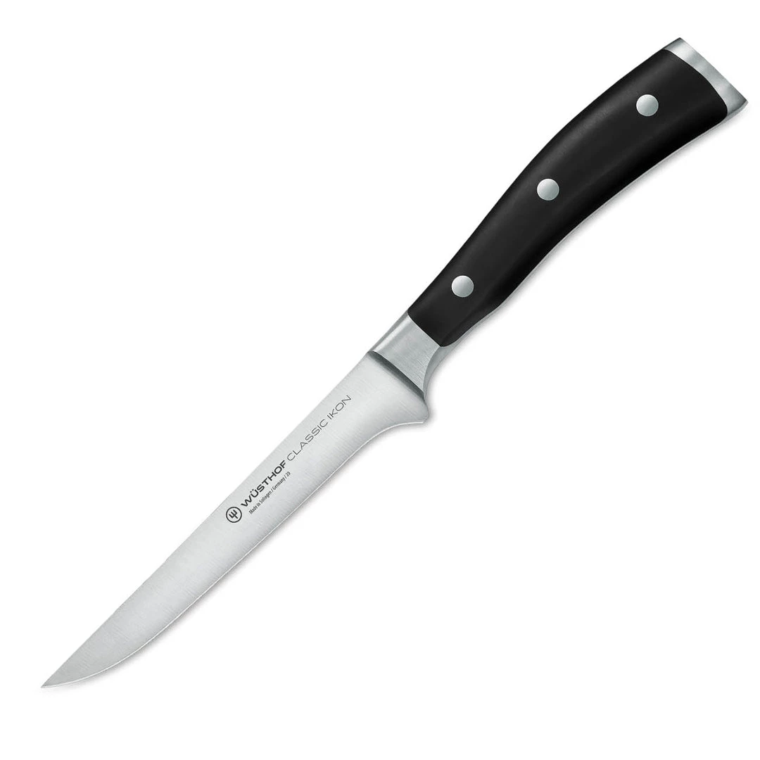 CLASSIC IKON knives feature a distinctive, double bolster design for professional-style heft, exceptional balance and beauty. The handle is made of a highly durable synthetic material – Polyoxymethylene (POM) – which has a tighter molecular structure to resist fading and discoloration. The elegant shape of the handle is designed for a comfortable grip. The CLASSIC IKON 5″ Boning Knife is ideal for removing bones in pork, beef or chicken. The long narrow curved blade enables the knife to move cleanly along the bones for clean cuts.