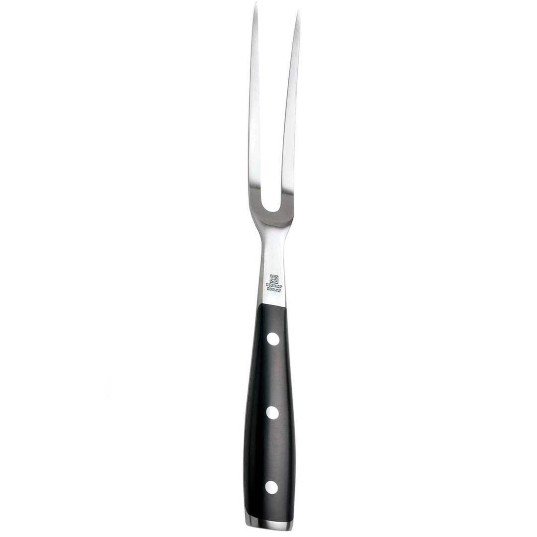 CLASSIC IKON knives feature a distinctive, double bolster design for professional-style heft, exceptional balance and beauty. The handle is made of a highly durable synthetic material – Polyoxymethylene (POM) – which has a tighter molecular structure to resist fading and discoloration. The elegant shape of the handle is designed for a comfortable grip. The CLASSIC IKON 6″ Double Bolster Curved Meat Fork works elegantly with the WÜSTHOF Carving Knife. This two pronged fork helps guide the carving knife away from your hands and efficiently slice large roasts. The meat fork also holds meat in place while slicing or serving.
