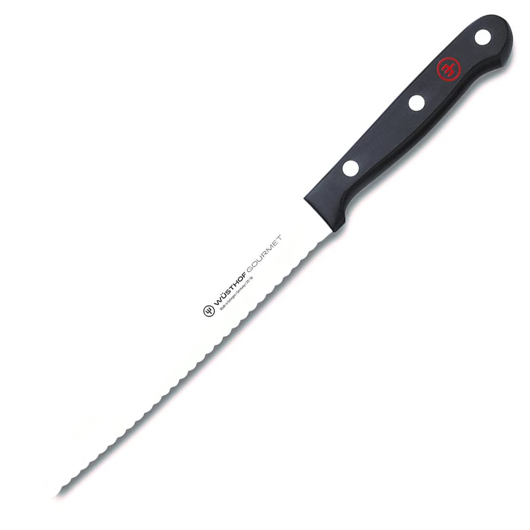 Slicing fruit and soft-skinned vegetables is easy with the 6″ Serrated Utility Knife. The knife features a razor-sharp edge equipped to slicing without tearing or smashing your food. The high-carbon, stainless steel blade prevents rusting and stains from developing, allowing it to maintain a beautiful look during years of use. The knife’s handle features Wusthof’s signature triple rivet handle, able to provide a comfortable grip as you slice. The sharp edge will effortlessly cut through delicate fruits and vegetables without a problem. After the first use, it will quickly become your favorite tool during food prep. The handy utility knife display’s the high-quality craftsmanship built by Wusthof. It’s specially formulated to give nothing less than superior results. You will enjoy the convenience and strength this utility knife has to offer. Also available with a 4.5″ blade, or a 5″ blade.