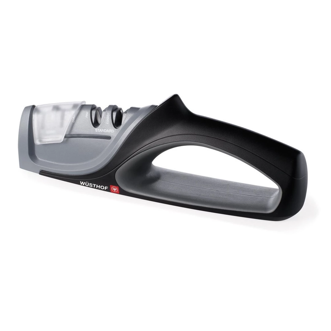 Sharpen both your Standard knives and your Asian style knives with the Wusthof 4 stage knife sharpener. The standard sharpener uses carbide blades set at 28 degrees or 14 degrees per side to sharpener your standard kitchen knives. Stage 2 of the standard side uses ceramic rods to hone a fine edge on your blade. Simply slide the cover over to Asian knives to sharpen your Asian knives to a 20 degree angle or 10 degrees per side. The V-shaped cutting head with two crossed carbide blades puts a quick edge on knives. Stage 2 uses ceramic rods to hone the fine edge of your Santoku or Nakiri knives. Simply place the gadget on a flat work surface and hold the E-Z grip handle with one hand and the knife handle with the other. Insert the knife blade fully into the slot at a 90-degree angle to the sharpener and pull down and back three or four times to sharpen. After setting the knife’s edge with the carbide side, use the unit’s ceramic side to nicely finish the edge. The four-stage knife sharpener measures 9 by 3 by 1-1/2-inches.