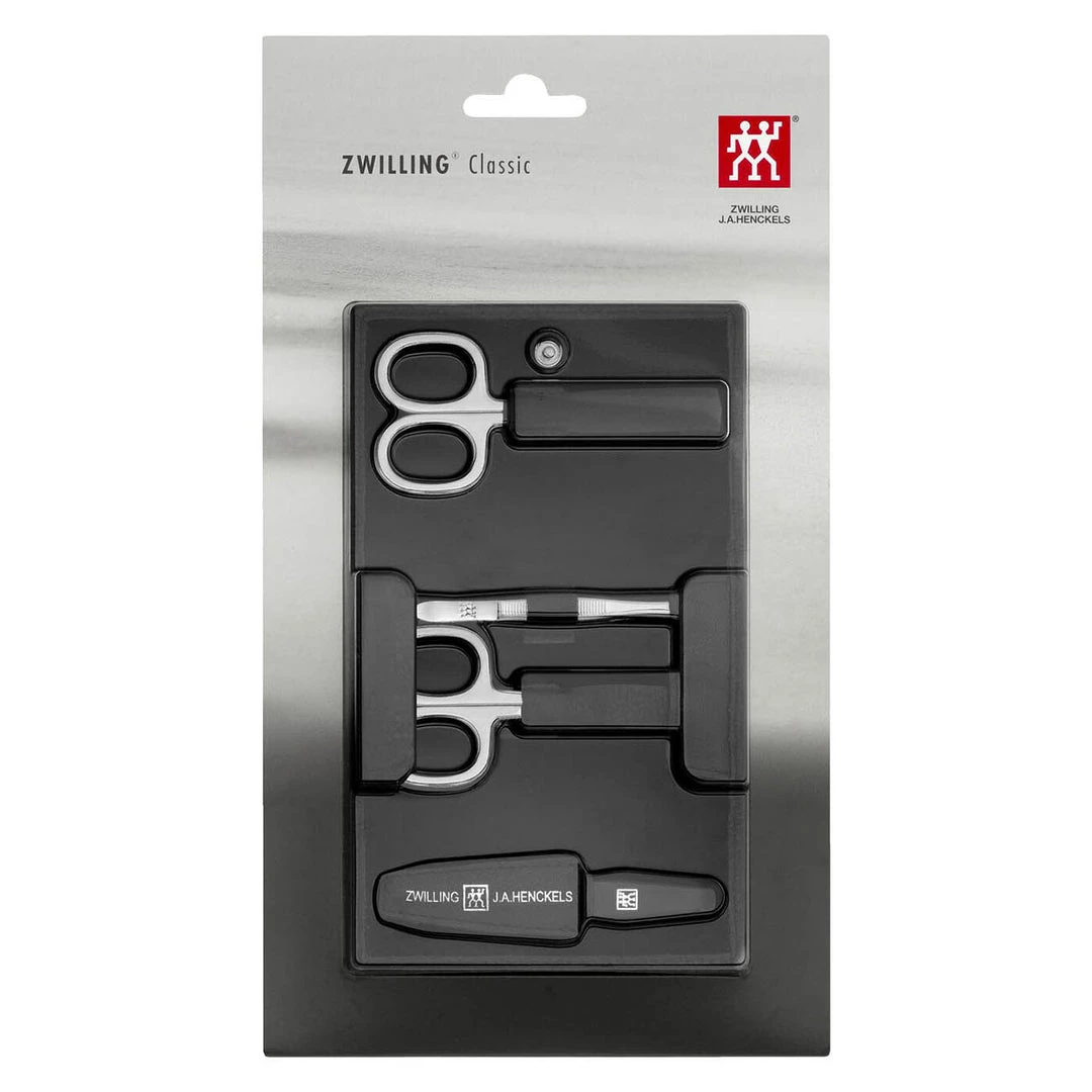 This 5-piece nailcare set from the CLASSIC line includes everything you need for beautiful, groomed nails, all at a great value. The elegant black leather case with snap fastener securely holds nail scissors, cuticle scissors, a sapphire nail file, and a slant tweezer. The sharp nail scissors are designed for precision when cutting nails. The cuticle scissors are tapered and curved for maximum control when cutting cuticles. The file is for shaping and smoothing nail ends. And the slant tweezer makes eyebrow maintenance effortless. These long-lasting CLASSIC products are made of polished stainless steel and deliver maximum functionality and corrosion resistance.