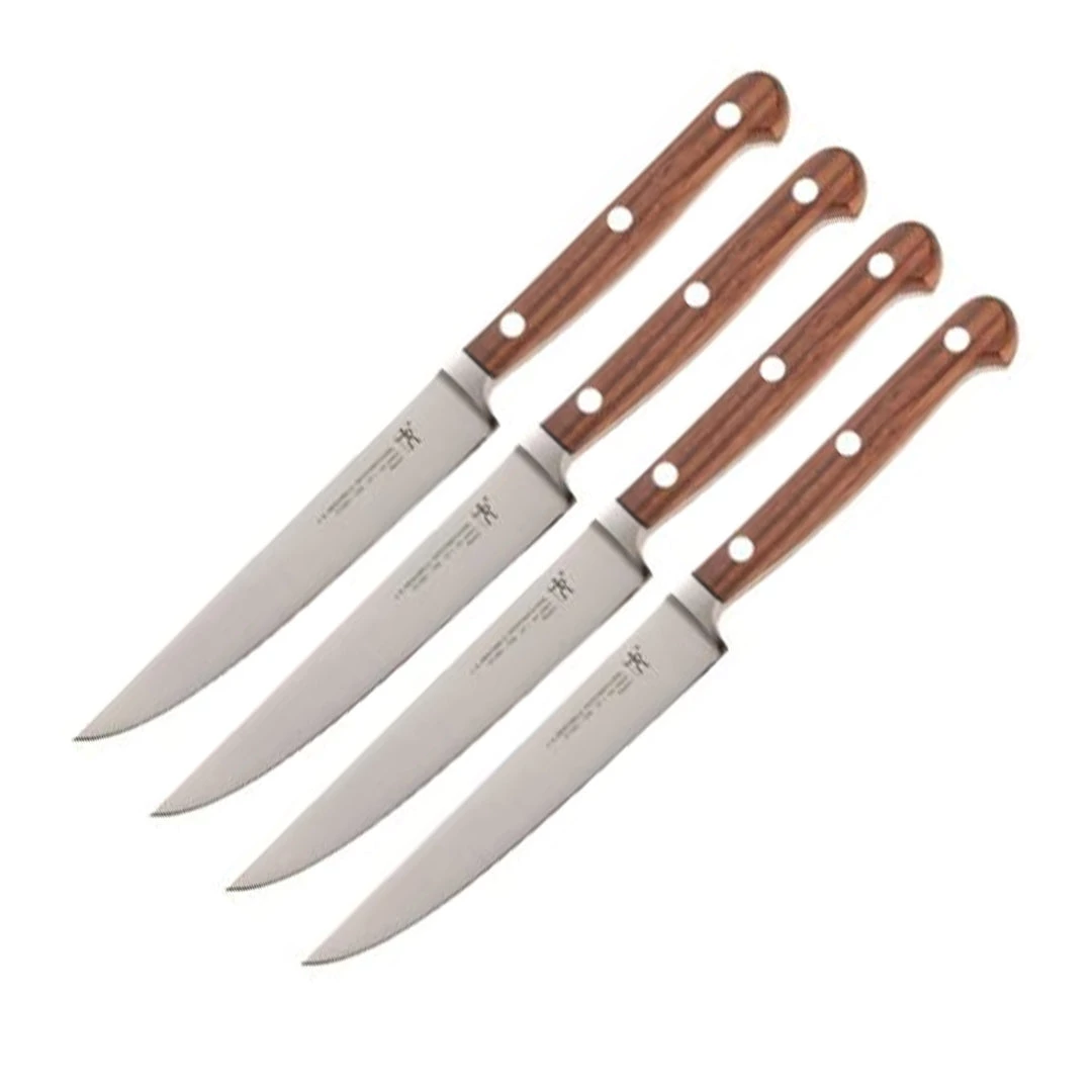 Founded in Germany in 1731, Zwilling J.A. Henckels is renowned for creating high-quality cutlery that is covered by a lifetime warranty. The steak knives in this four-piece set have great balance, weight, and durability to ensure a lifetime of and precision cutting. The knives feature attractive, stainless steel blades and triple-riveted, natural hardwood handles. These knives should be washed by hand to preserve their superior finish and to keep the blades from becoming blunt.