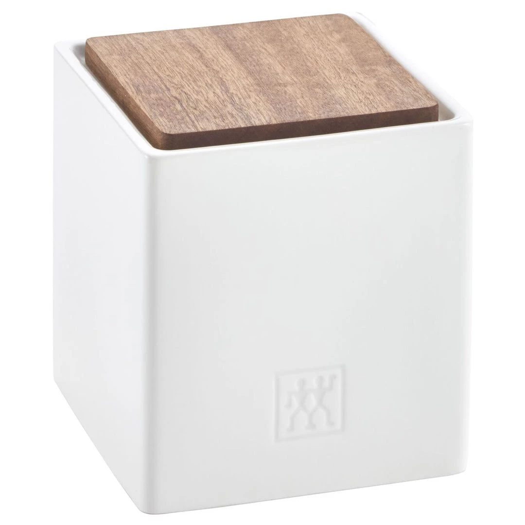 What is even the most delicious meal when cooked or garnished without fresh herbs? Exactly, it lacks that final touch! Fresh herbs are a must for any delicious meal – dried and frozen spices are simply no match. Rosemary, chives, basil and parsley – such herbs create such a wonderful aroma in the kitchen and look both attractive and delicious. The sturdy ZWILLING’s Storage series storage containers are just the thing. Because the handy containers are that final touch for your kitchen. Thanks to the included plastic insert, you can simply repot your fresh kitchen herbs in the 120 mm container. Spices, salt, pepper and even small kitchen utensils, such vegetable peelers, all have a place in the ceramic container. The sapele wood lids also allow the handy containers to be stacked. This saves space on work surfaces and in storage areas. The elegant combination of white ceramic and sapele wood creates a wonderful contrast. Ceramic is very durable and especially hygienic, meaning that the storage container is both practical and decorative. The highlight of our ZWILLING Storage series is that the individual storage containers with lid can be endlessly added to. They are available both individually and in sets.