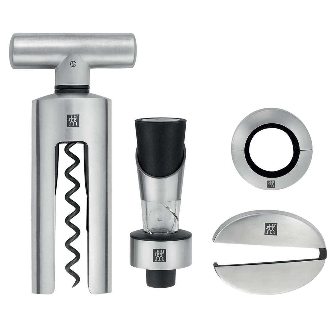 The four piece Sommelier Set includes a Corkscrew, Decanter, Drop Ring and Foil Cutter presented in an elegant gift box. The Corkscrew features a robust hardened spiral with a high quality non-stick coating . The rungs on the inner housing of the shaft ensure a perfect fit to all bottle neck sizes. The Decanter has a unique integrated spiral system which aerates the wine while pouring. The nuances of flavor are optimized as the wine is poured into the glass. Also includes a stopper feature for convenient storage. The Drop Ring features magnetic rings ensure perfect fit to any bottle neck. Washable black felt catches any drops of wine. The Foil Cutter features a flexible hinge suitable for any bottle neck. Four sharp cutting rings remove foil from bottle easily with only one turn of the cutter.
